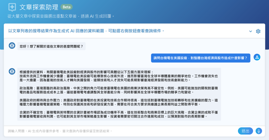 能從指定範圍的文章中精準定位答案、歸納重點,支援簡答與詳答兩種模式,並可透過語音輸入,大幅節省搜尋與閱讀時間。